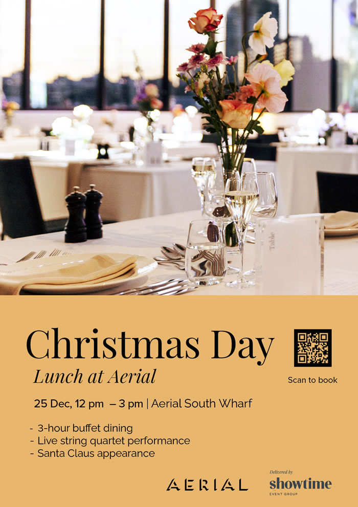 Celebrate Christmas at Aerial South Wharf with a premium three-hour buffet featuring seafood, roasts and festive desserts, plus live string quartet entertainment and a special visit from Santa. Tickets are $181 adults, $120 teens, $75 children and toddlers dine free.